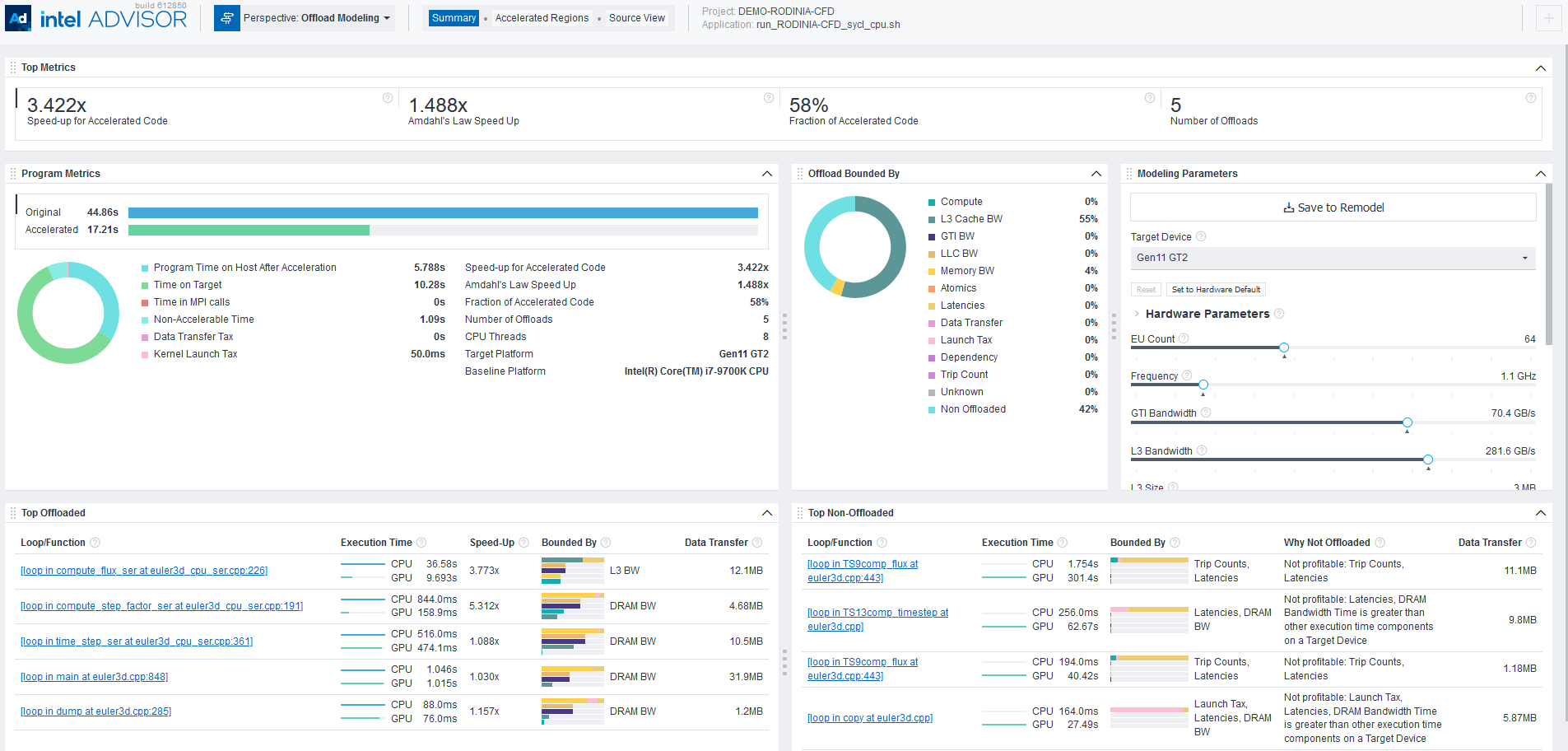 インテル® Advisor CLI を使用して、個別のコマンドでそれぞれのオフロードのモデル化解析を実行し、アプリケーションのデータを収集してパフォーマンスをモデル化できます。このオプションは次を可能にしまします。