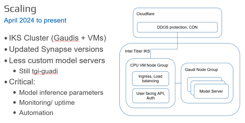 現在のスケーリング・フェーズ (2024年4月~現在) では、Prediction Guard はインテル® Tiber™ AI クラウド内の Kubernetes ベースのインフラストラクチャーに移行し、CPU とインテル® Gaudi® 2 AI アクセラレーター・ベースのノードグループを組み合わせています。デプロイの自動化、稼働時間とパフォーマンスの監視、DDoS 防御と CDN サービスのため Cloudflare の統合が実装されました。