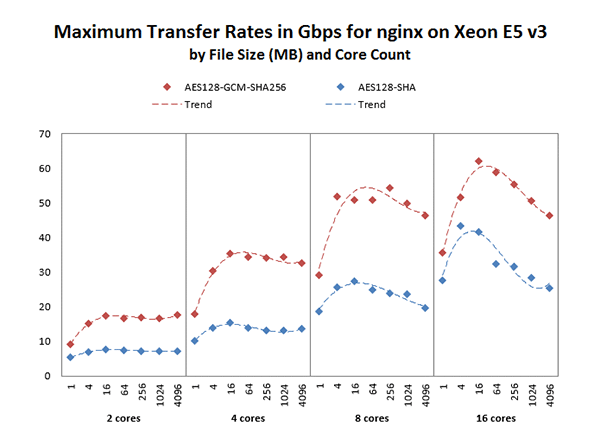 AES-GCM を活用できない大量のクライアントのために AES-CBC と HMAC+SHA1 ダイジェストのサポートは続ける必要がありますが、インテル® Xeon® プロセッサー v3 ファミリーで実行する Web サーバーでは、この暗号が提供する最良のパフォーマンスを引き出すために、AES-GCM を有効にすべきです。