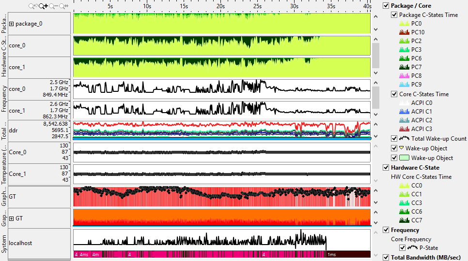 In the second example, the CPU spends most time in the active state, and the similar activity levels for the Core C-States and Frequency indicates balance in the distribution of that activity.