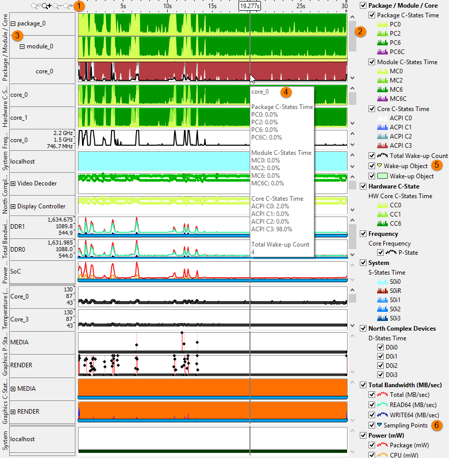 Tooltips | Hover over the individual timelines to see data specific to that metric at that point during the collection. In the example, the C-States and Wake-up Counts for the Packages, Modules, and Cores are shown. |