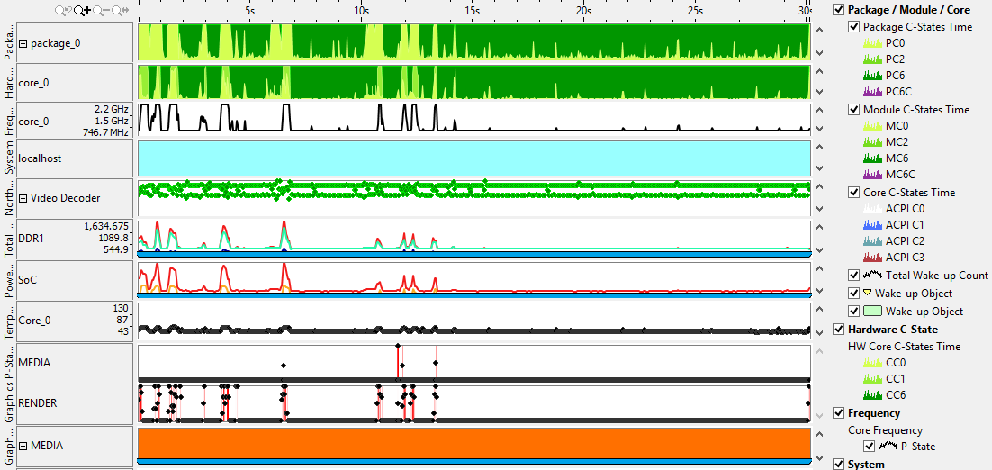 The timelines in the Correlate Metrics window can also be found in other sub-tabs with the Platform Power Analysis result tab. The Correlate Metrics window is a good starting point if you are interested in identifying areas of energy inefficiency.