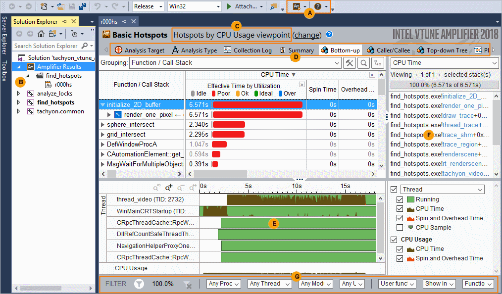 インテル® VTune™ Amplifier の結果 *.amplxe は、[ソリューション エクスプローラー] の [My Amplifier Results] フォルダーに表示されます。結果収集を設定および制御するには、[ソリューション エクスプローラー] でプロジェクトを右クリックして、コンテキスト・メニューから [Intel VTune Amplifier] を選択します。前に収集した結果を管理するには、結果 (例えば、r000ge.amplxe) を右クリックして、ポップアップ・メニューからコマンドを選択します。 |
