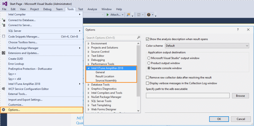 Visual Studio* のメニューから [ツール] > [オプション...] メニューを選択し、[オプション] ダイアログボックスからインテル® VTune™ Amplifier のオプションにアクセスすることができます。
