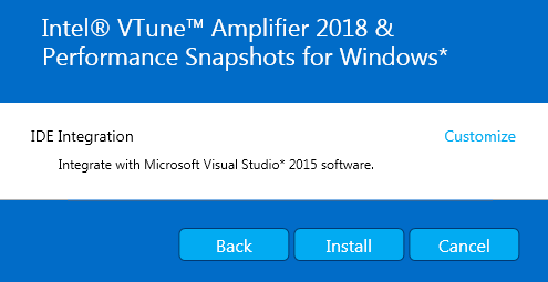 インテル® VTune™ Amplifier は、デフォルトで Visual Studio* へ統合されます。統合される Visual Studio* のバージョンは、インストール・ウィザードの [Installation Summary (インストール・サマリー)] で設定されています。複数のバージョンの Visual Studio* がインストールされていて、特定のバージョンにのみ統合する場合、[Installation Summary] ページで [Customize (カスタマイズ)] ボタンをクリックして、[Choose Integration Target (統合ターゲットの選択)] ページで統合する対象を選択します。