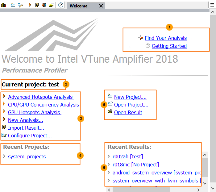 デフォルトで、インテル® VTune™ Amplifier は、次に行うべきステップと必要なオプションへのリンクを示す「Welcome」ページを開きます。