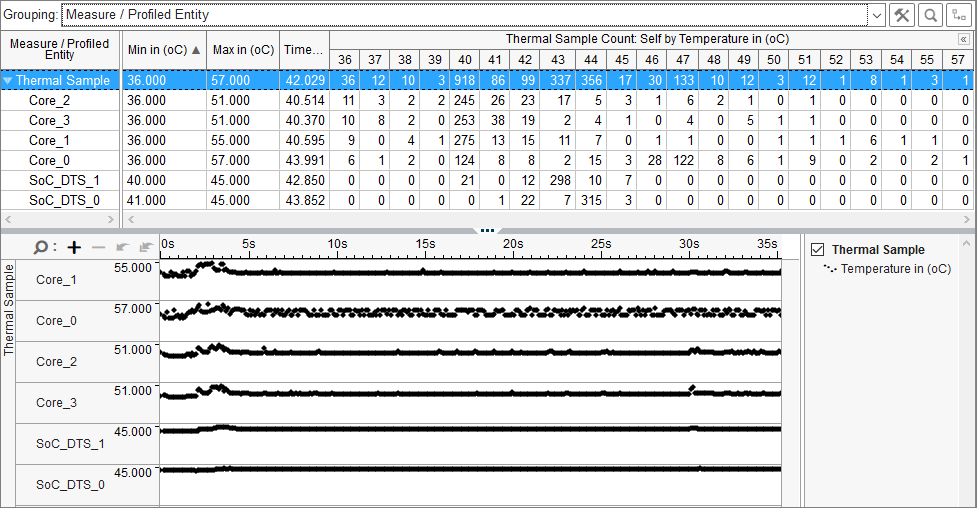 To access this window: Select the Platform Power Analysis viewpoint and click the Temperature (Windows*) or Thermal Sample (Linux*/Android*) sub-tab in the result tab.