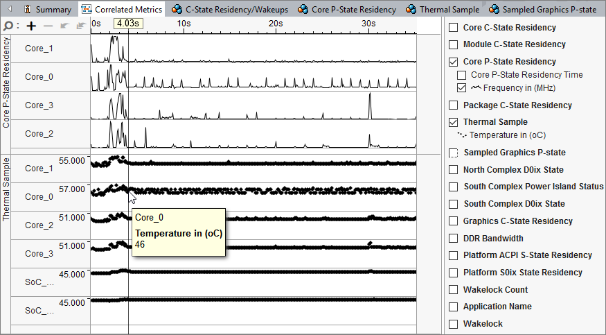 Shifts in core temperature often mirror shifts in processor frequency. When the processor runs at a higher frequency, the temperature also rises. In the following example of the Correlated Metrics tab showing both Thermal Sample and Core P-State Frequency data, both the temperature and the frequency fluctuate for the first 4 seconds of collection and then remain fairly stable.