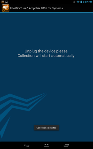 Configure the Intel® VTune™ Amplifier to run the collection on a detached device by using the Analyze unplugged device option.