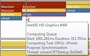 For the GPU analysis of applications using OpenCL software technology, the Timeline pane in the Graphics window provides the following tabs: