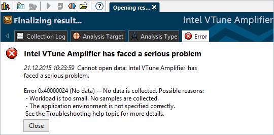 Error message: Cannot open data. Intel® VTune™ Amplifier has faced a serious problem.