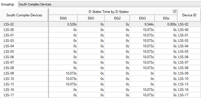 The South Complex contains low-intensity computing sub-systems, such as I/O and system management components. D0ix states are low-power states used on system on a chip (SoC) platforms. The South Complex devices are represented using logical sub-system (LSS) identifiers specific to the platform on which the collection was run.