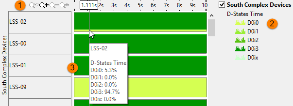 The Timeline pane displays the D0ix states of each device, at each point in time. You can rearrange the order of the devices in the timeline by dragging and dropping.