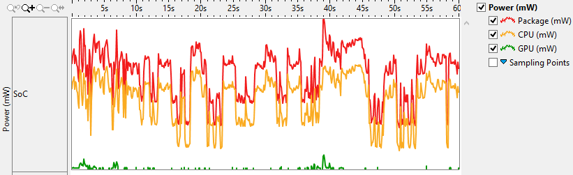 Use the toolbar at the top of the Timeline to zoom in/out on the view on areas of interest. Use the legend on the right to filter in/out any type of data presented on the timeline by selecting/deselecting check boxes. The blue sampling points indicate the point at which the sample was obtained from the hardware. The duration between sampling points is the sampling interval, which was specified during collection. Consider removing the sampling points when viewing the full timeline to see low energy metrics and adding them in after zooming in on a section of interest.