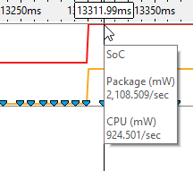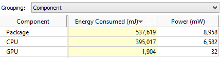 The Power Pane shows the amount of energy consumed by each component during collection (mJ and mW). The energy consumption is an estimate of the power consumed and not an exact measurement by the hardware. Consider running the same analysis on the device for a second time to have two sets of power metrics for data comparison.
