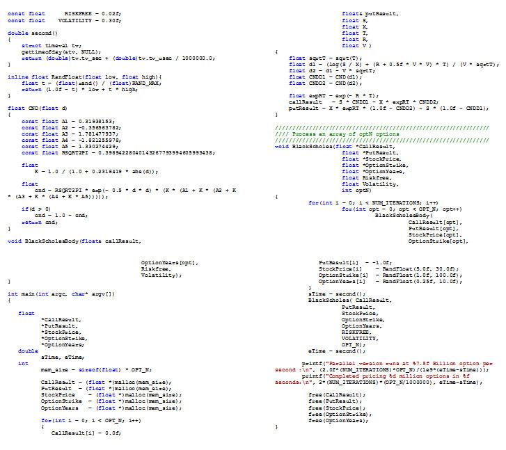 『Numerical Recipes in C』に掲載されている多くのルーチンと同様に、ブラック-ショールズ式は float で記述されています。ほとんどの金融工学アプリケーションは、32 ビット浮動小数点のダイナミック・レンジで十分です。入力データ、出力データ、計算はすべて 32 ビットです。32 ビットから 64 ビットへの変換を行うと、パフォーマンスは低下しますが精度は向上しません。定数およびライブラリー関数呼び出しはすべて、明示的に float にしてください。