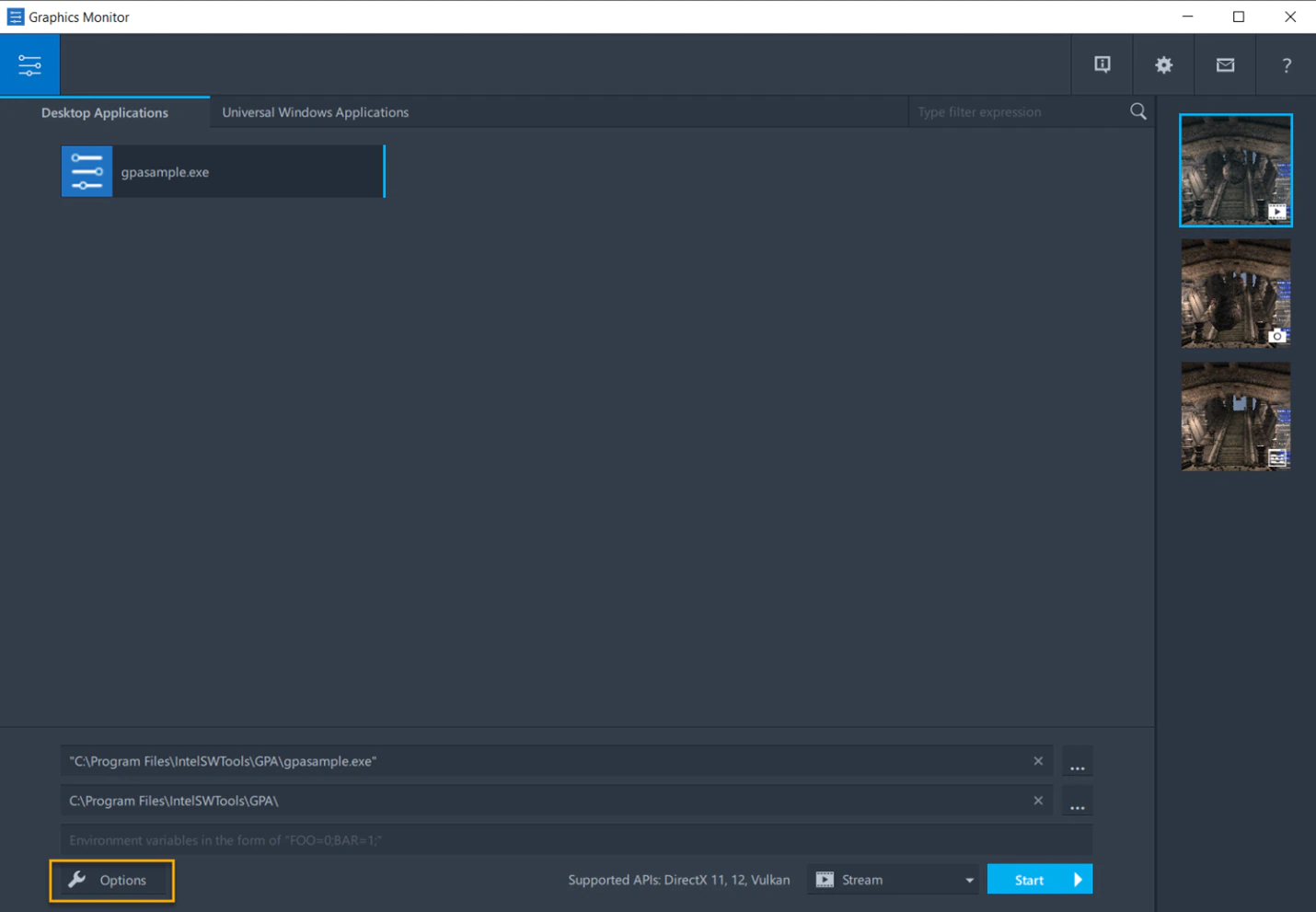 グラフィックス・モニターは、インテル® GPA 解析ツールのハブツールです。グラフィックス・モニターでは、トレース・キャプチャーとストリーム・キャプチャーのオプションと設定を選択します。