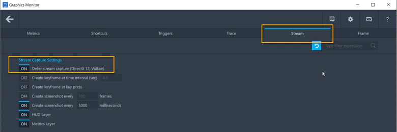 ゲームプレイの任意の時点で複数のストリームをキャプチャーするため、遅延ストリーム・キャプチャーを有効にしてください。そうしないと、ゲームが始まってからキャプチャー・ウィンドウを閉じるまで、キャプチャーが強制的に行われます。グラフィックス・モニターの [Options] セクションで [Defer stream capture] をオンにします。