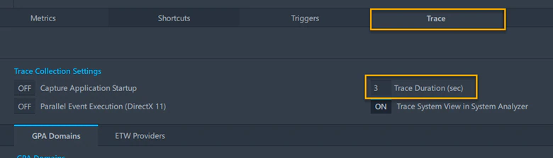 - トレース: グラフィックス・トレース・アナライザーがトレースをキャプチャーすると、アプリケーション実行中の CPU と GPU の両方のアクティビティーが記録されます。デフォルトでは、5 秒間のデータがキャプチャーされます。