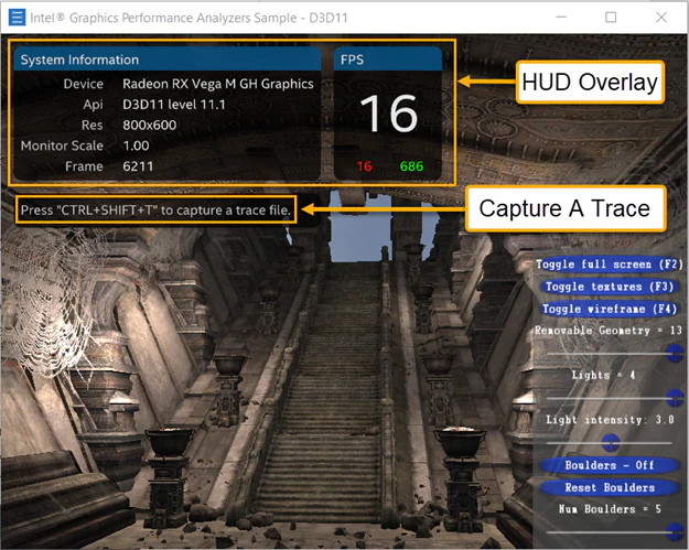 図 7: HUD オーバーレイ付きでゲームを実行 (キーを押すとトレースが開始されます)