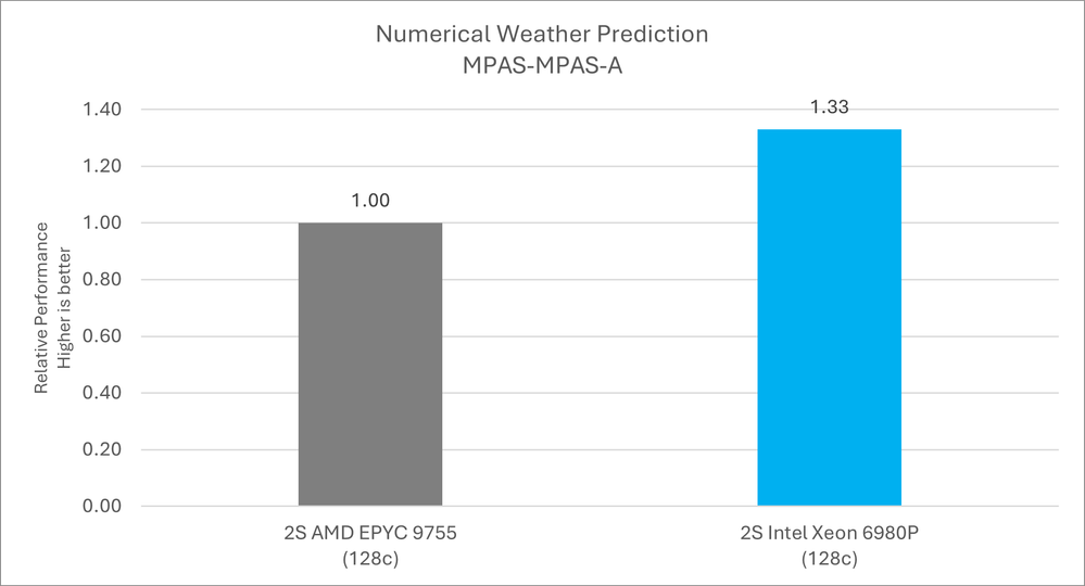 MPAS-A システムは大気の状態を重視しており、非構造化ボロノイメッシュを用いて可変解像度シミュレーションを実現することで、地球規模の環境において詳細な地域規模の予測を可能にします。MPAS-A は、熱帯気象学、極端気象現象、および長期気候シミュレーションに関する研究でよく利用されています。インテル® Xeon® 6980P 128 コア・プロセッサーは、128 コアの AMD EPYC 9755 と比較して、最大 1.33 倍の MPAS パフォーマンスを実現しました。