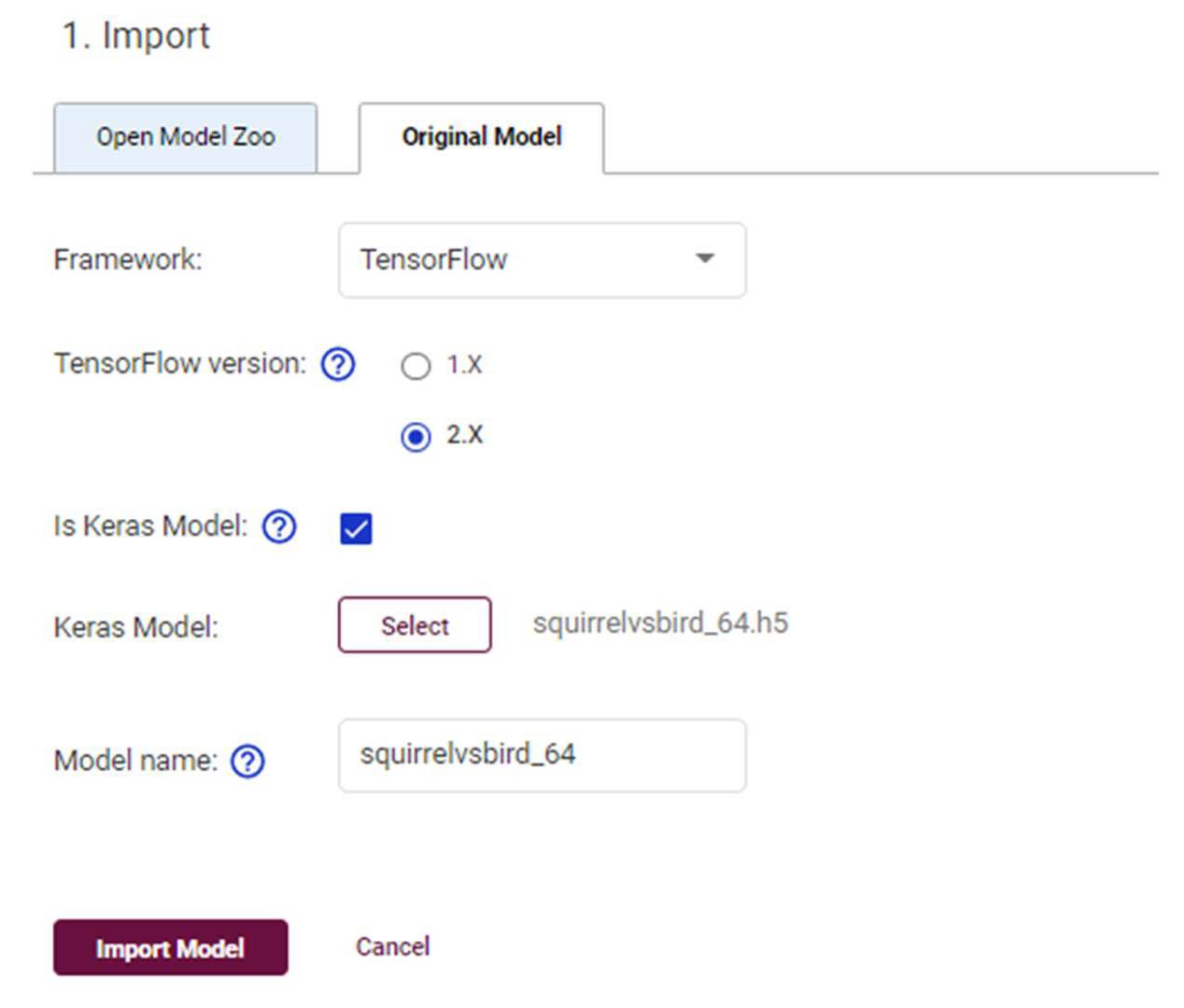 DL ワークベンチの [Create Configuration] ページから、[Import] ボタンをクリックして [Original Model] タブを選択すると、カスタムモデルをインポートできます。SquirrelVsBird モデルを読み込むには、[Framework] ドロップダウン・メニューから [TensorFlow] を選択します。[TensorFlow Version 2.x] を選択すると、[Is Keras Model] チェックボックスが表示されます。チェックボックスをクリックしてから、[選択] ボタンをクリックして、Keras モデルを含む H5 ファイルを選択できます。