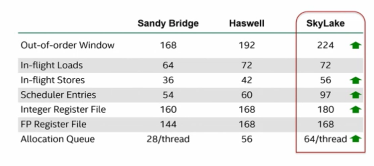 - 命令の並列性の強化。1 クロックあたりの命令数が増えたことで、より深いアウトオブオーダー・バッファーにより命令実行の並列性が向上しました。