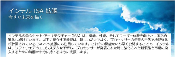 インテル命令セット・アーキテクチャー拡張のディスカッションについては、デベロッパーゾーンのフォーラム (https://software.intel.com/en-us/intel-isa-extensions#pid-15993-1495) をご覧ください。
