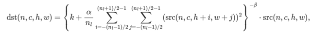 LRN プリミティブは、次の式で定義される順方向もしくは逆方向のローカル応答正規化操作を行います。変数名は標準の規則に従います。