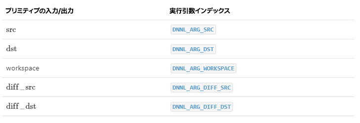 注: この節では、可読性のためデータタイプの名称を省略しています。例えば、dnnl::memory::data_type::f32f32 に省略されます。