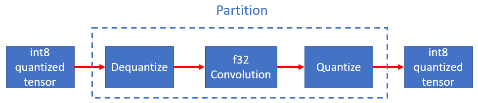 oneDNN グラフのパーティション化 API は、逆量子化、量子化、畳み込み操作を含むパーティションを返すことがあります。ユーザーは、サブグラフパターンを認識して融合操作に変換する必要はありません。oneDNN グラフの実装能力に応じて、パーティションに含まれる操作数が変動する可能性があります。