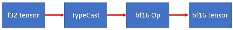 bf16 では、oneDNN グラフは f32 テンソルを bf16 または f16 に、またはその逆に変換する TypeCast 操作を提供します。すべての oneDNN グラフ操作は bf16 と f16 をサポートします。数値精度を明確にするため、TypeCast を挿入するのはユーザーの責任です。oneDNN グラフの実装は、ユーザーが指示する数値精度に従います。ユーザーが f32 から bf16 にタイプキャストして、その後逆に戻す場合、oneDNN グラフ実装は正確にデータタイプ変換を行います。