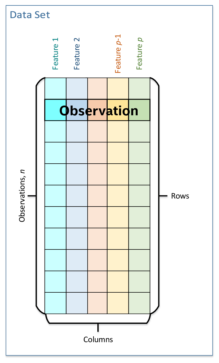 oneDAL が動作する主なデータに関連する概念はデータセットです。これはデータを表形式で表したものであり、表の行は観測値を示し、列は特徴を示します。