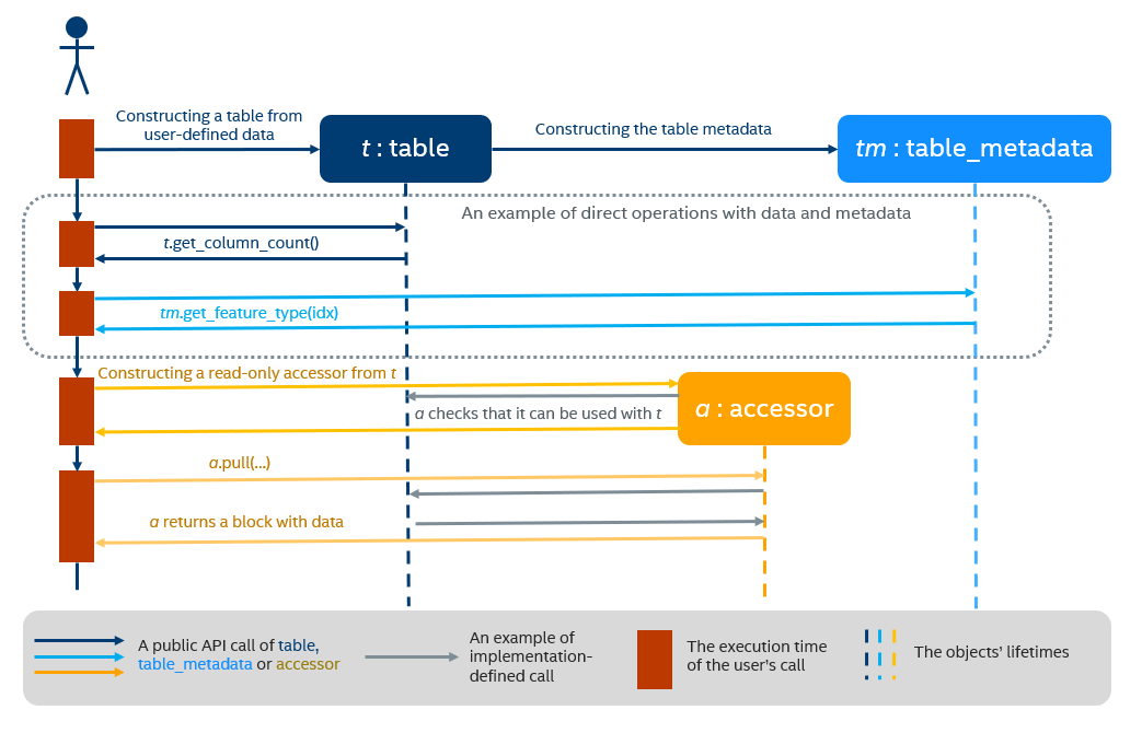 テーブル・オブジェクトが作成されると、計算の入力として、もしくはアルゴリズムのパラメーターとして使用できます。テーブルのデータには、図に示すように、独自のインターフェイスや読み取り専用アクセサーを介してアクセスできます。