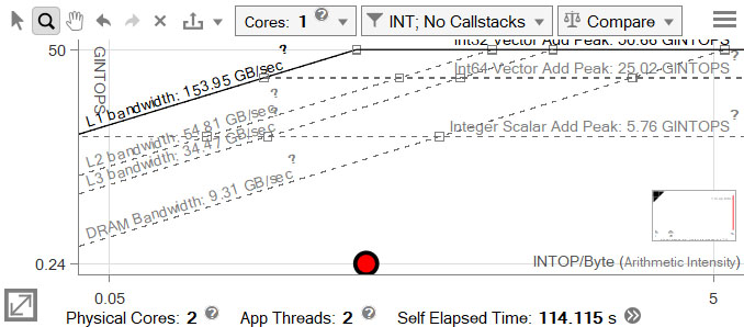 インテル® Advisor ルーフライン機能の最初のバージョンは、浮動小数点演算のみをサポートしていましたが、インテル® Advisor 2019 では整数演算のサポートが追加され、マシンラーニングのような整数処理が多いアプリケーションに有用性を拡大しました。