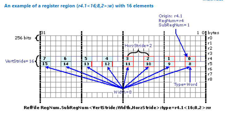 src0 は r1.14<16;8,0>:b です。最初のバイトサイズの値は r1.14 から始まります。ストライド値 0 は領域の幅 (8) で値を繰り返します。次に、r1.30 から始まる領域が続き、そこに 8 回格納された値を繰り返します。つまり、値 {1,1,1,1,1,1,1,1, 4, 4, 4, 4, 4, 4, 4, 4} を操作します。
