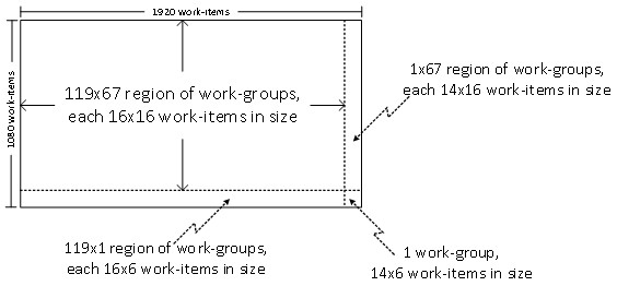 OpenCL* 2.0 では、この問題に対応する新しい機能が追加されています。この機能は、「不均等なワークグループ」と呼ばれ、OpenCL* 2.0 ランタイムが NDRange のすべての次元を不均等なワークグループ・サイズに分割できるようにします。この機能を利用すると、プログラマーが NDRange を均等に分割できないワークグループ・サイズを指定した場合、ランタイムはできるだけ多くのワークグループが指定されたサイズになり、残りのワークグループは異なるサイズになるように NDRange を分割します。例えば、NDRange が 1918×1078 ワークアイテムで、ワークグループ・サイズが 16×16 ワークアイテムの場合、OpenCL* 2.0 ランタイムは次の図に示すように NDRange を分割します。