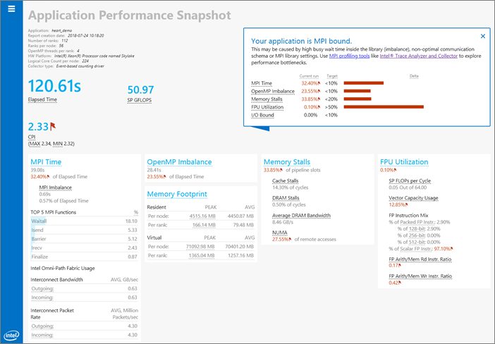 アプリケーション・パフォーマンス・スナップショットを利用して、共有メモリーや MPI アプリケーションによる利用可能なハードウェア (CPU、FPU、メモリー) の使用状況を素早く確認できます。アプリケーション・パフォーマンス・スナップショットは、アプリケーションが MPI に費やした時間、MPI と OpenMP* のインバランス、メモリーアクセス効率、FPU 利用率、I/O とメモリー使用量を解析します。解析後、インテル® プラットフォームを使用するシステムの基本的なパフォーマンス向上の可能性を示します。このツールをアプリケーション・パフォーマンス解析の開始点として使用し、主な最適化領域の概要を取得して、特定のアプリケーション・パフォーマンスに特化したプロファイル・ツールについて学びます。