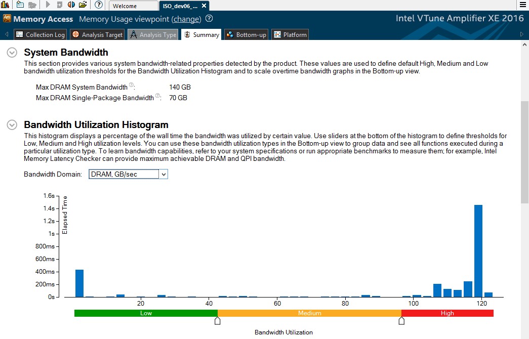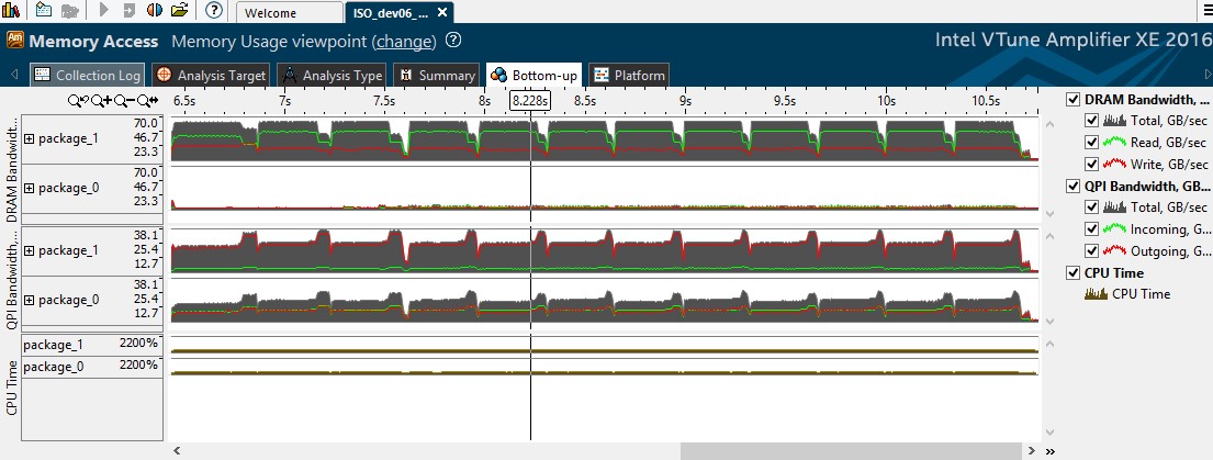 [Bottom-up (ボトムアップ)] ビューに切り替えてタイムラインを確認すると、DRAM 帯域幅がバランスよく使用され (2 つのソケット間で分散され)、QPI トラフィックも1/3 になったことが分かります。