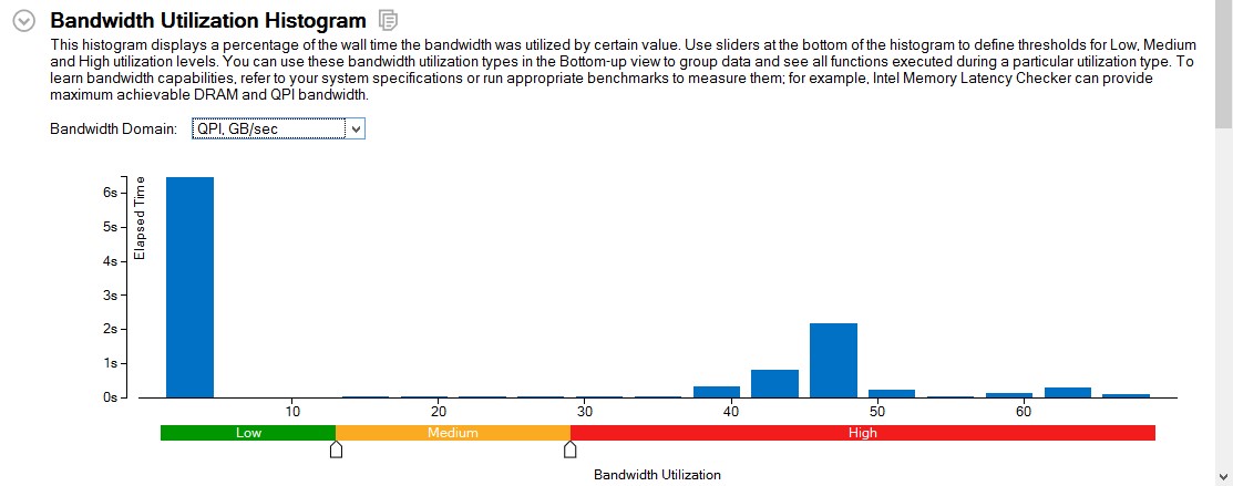 [Bandwidth Utilization Histogram (帯域幅の使用ヒストグラム)][Bandwidth Domain (帯域幅ドメイン)] ドロップダウンから QPI を選択すると、QPI 帯域幅の使用状況が低または中に軽減されたことが確認できます。
