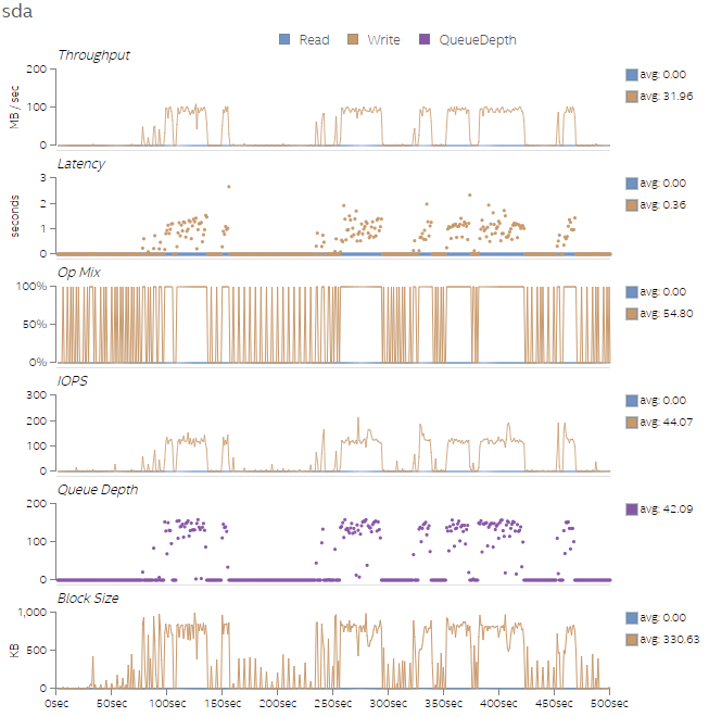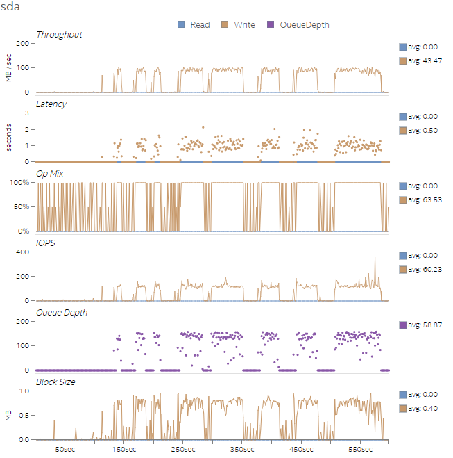 最後に、図 9 から図 12 に、4 つのテストのディスク利用率を示します。4 つのテスト実行では、後のテストのほうがワーク量が多く、ディスク速度が速いほどテストのパフォーマンスが向上することが分かります。トランザクションのバイト数はそれほど多くありませんが、I/O 操作 (iops) は完了の待機にかなりの時間を費やしています。これは、キューの深さグラフで確認できます。ディスクを変更することが困難である場合、スレッド数をさらに増やすことでディスクのアクセス・レイテンシーを緩和するのに役立ちます。