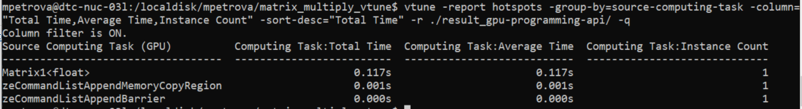 vtune -report hotspots -r result_gpu-hotspots_inst-count -source-object computing-task="Matrix1_1<float>" -group-by=address -limit=5 -q