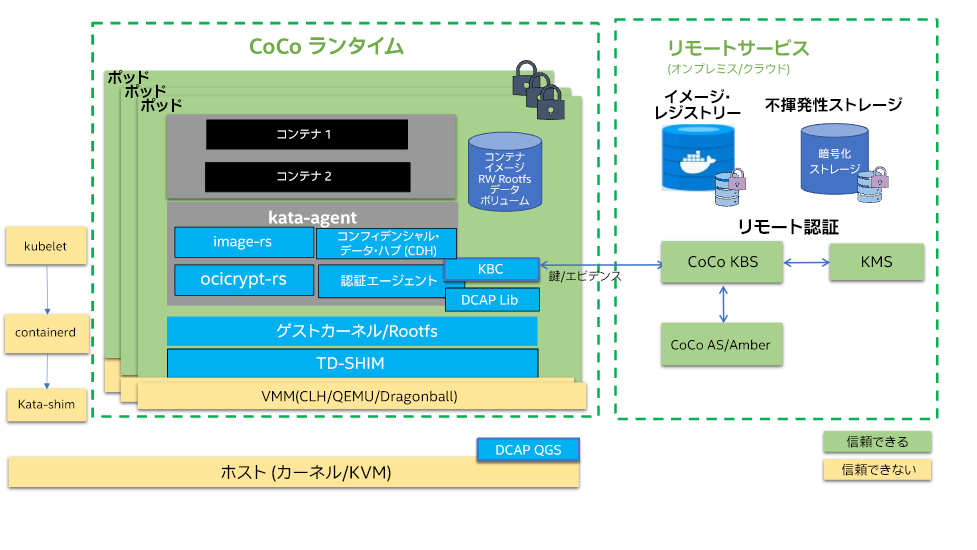 CoCo (英語) は、ハードウェア TEE、リモート認証、関連ソフトウェア・テクノロジーを利用して、コンテナ化されたワークロードに機密性、整合性、信頼性を提供する Cloud Native Computing Foundation (CNCF) のサンドボックス・プロジェクトです。インテル® TDX コンフィデンシャル・コンテナ・ソリューションは CoCo ベースで、簡単に使用できます。アプリケーション開発者は、変更されていないコンテナイメージをインテル® TDX コンフィデンシャル・コンテナで実行できます。クラスターのオペレーター/管理者は、共通のツールを使用して完全なソリューションをインストールし、Kubernetes* クラスターを管理できます。CoCo は、ランタイムだけでなくストレージやネットワーク上でも機密性の高い高価値のアプリケーション、データ、モデルに対するエンドツーエンドの保護を提供することにより、強力なセキュリティーを保証します (図 1) 。