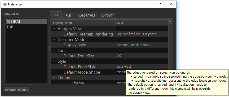 これは、[File] タブのグローバル・プリファレンスです。フローグラフ・アナライザー 2019 update5 で、新しい高速階層レイアウト・アルゴリズムが導入されました。次のプリファレンスを設定できます。