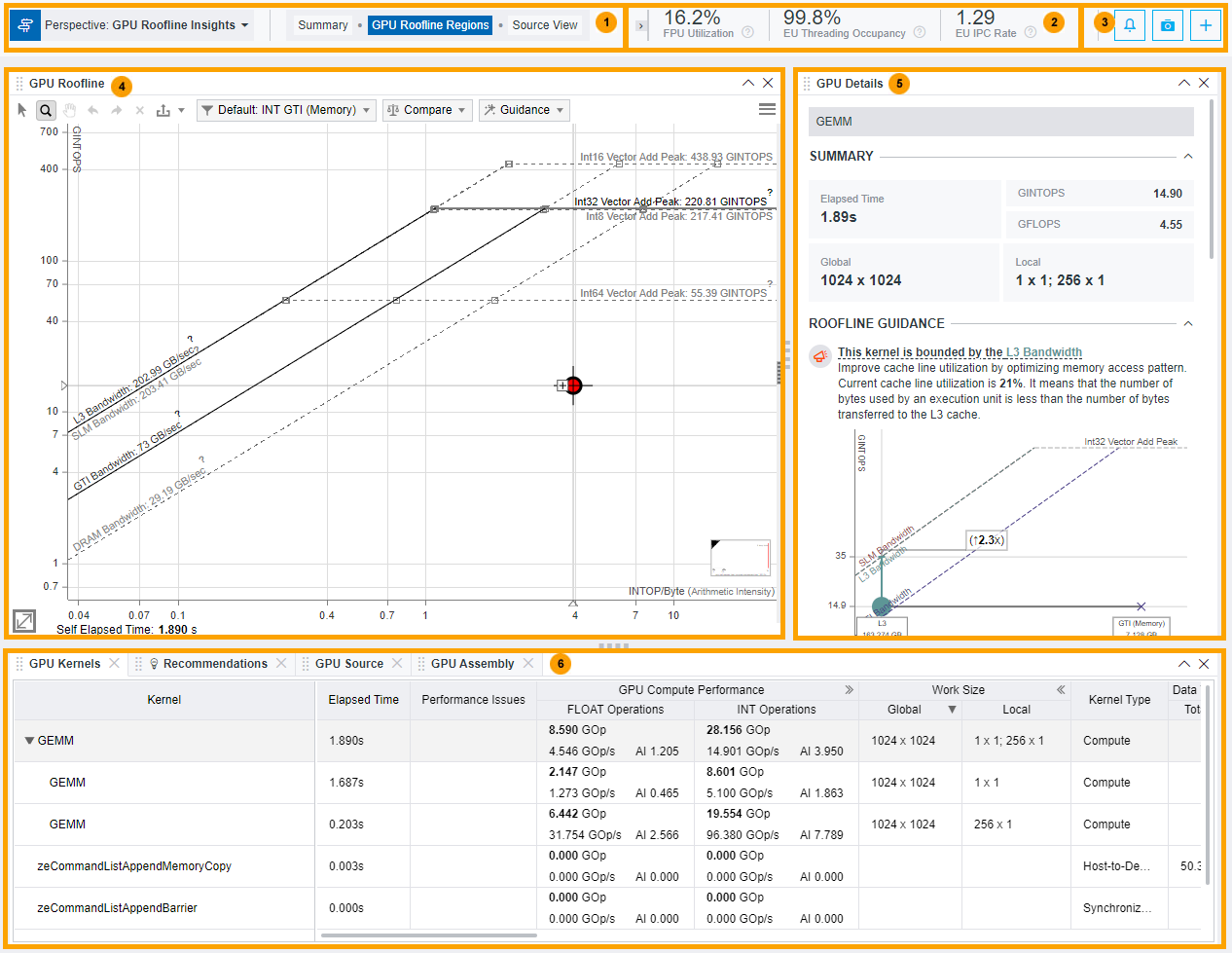 GPU ルーフラインの調査パースペクティブの結果の詳しい解釈については、GPU ルーフライン結果の調査を参照してください。