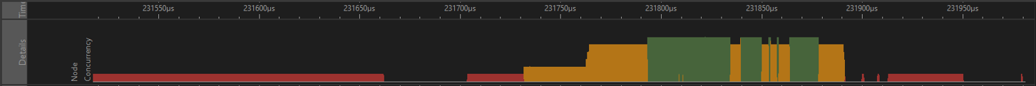 以下のスクリーンショットでは、memory_transfer_nodeに属するタスクが異なる色で表示されていることが分かります。相関機能を使用すると、アプリケーションの実行プロファイルをデバッグする際に実行関係が分かりやすくなります。フローグラフ・アナライザー には特定のパフォーマンスに関連する問題に注目する機能も含まれており、別のセクションで潜在的なパフォーマンスの問題ついて詳しく説明します。