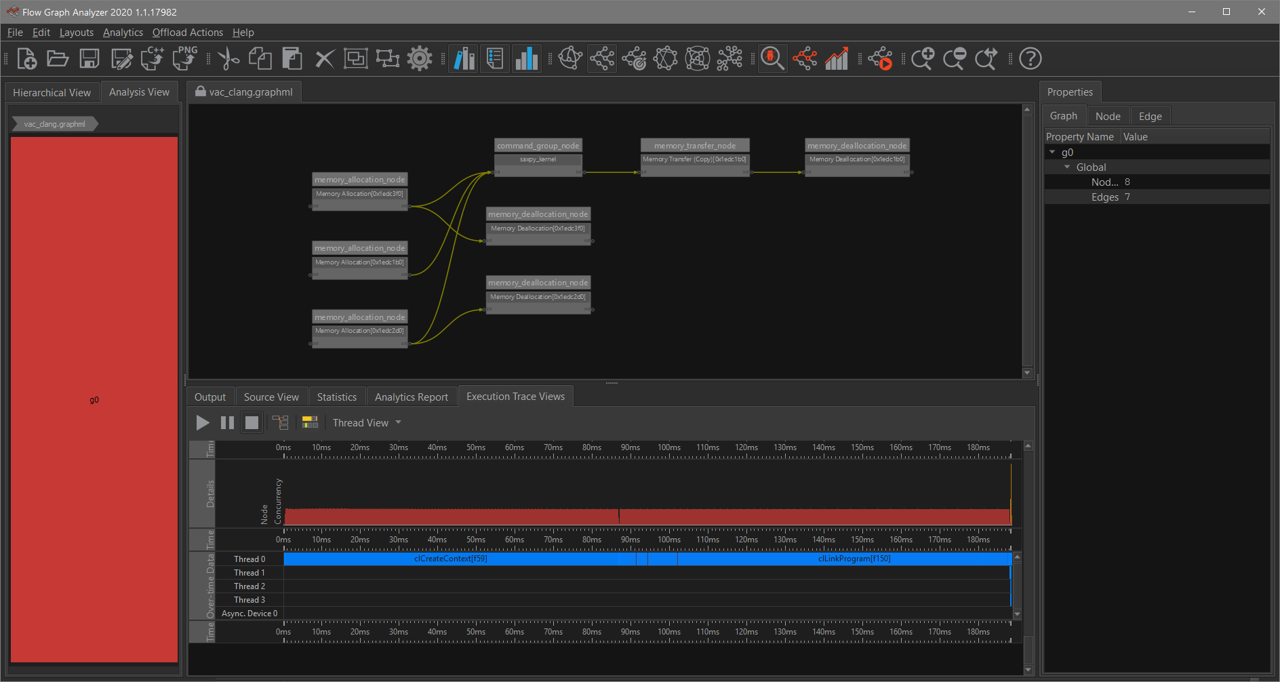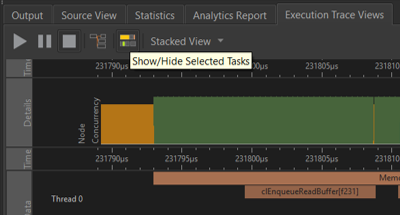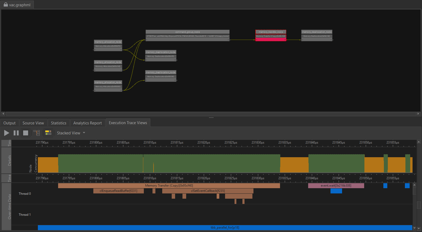フローグラフ・アナライザー で表示されるサンプルデータを上記に示します。他のランタイムと同様に、グラフ表示は実行トレースビューと関連付けられています。ワークフローは、SYCL* でも同様の情報を示します。実行トレースビューで重複するタスクを正確に可視化するには、プルダウンメニューから [Stacked View (スタックビュー)] 属性を選択します。