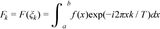 実数値関数 f(x) が範囲 [a, b] 外のゼロで、N 個の等距離のポイント xn = a + nT/N (ここで、T = |b - a| および n = 0, 1, ... , N-1) でサンプリングされると仮定します。FFT を使用して、ポイント ξk = k2π/T (ここで、k = 0, 1, ... , N/2) の積分を評価します。