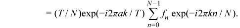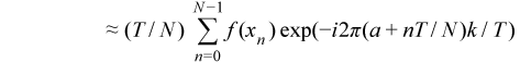 最後の行の合計は定義による FFT です。関数 f のサポートがゼロ付近で対称的に拡張される、つまり [a, b] = [-T/2, T/2] の場合、合計の前の係数は (T/N)(-1)k になります。