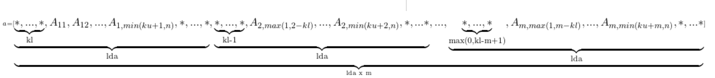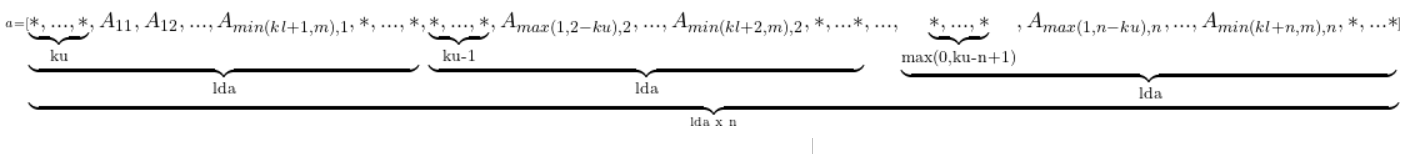 \[\scriptstyle a = [\underbrace{ \underbrace{\underbrace{*,...,*}_\text{k},A_{11},*,...,*}_\text{lda}, \underbrace{\underbrace{*,...,*}_\text{k-1},A_{max(1,2-k),2},...,A_{2,2},*,...*}_\text{lda}, ..., \underbrace{\underbrace{*,...,*}_\text{max(0,k-n+1)},A_{max(1,n-k),n},...,A_{n,n},*,...*}_\text{lda} }_\text{lda x n}]\]